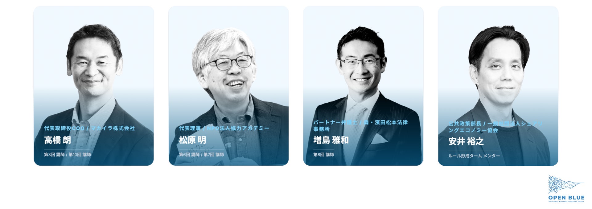 弁護士、政策アドバイザー、ロビイストなど、法規制とルールメイキングの各分野におけるプロフェッショナルがメンターとして参画します。
