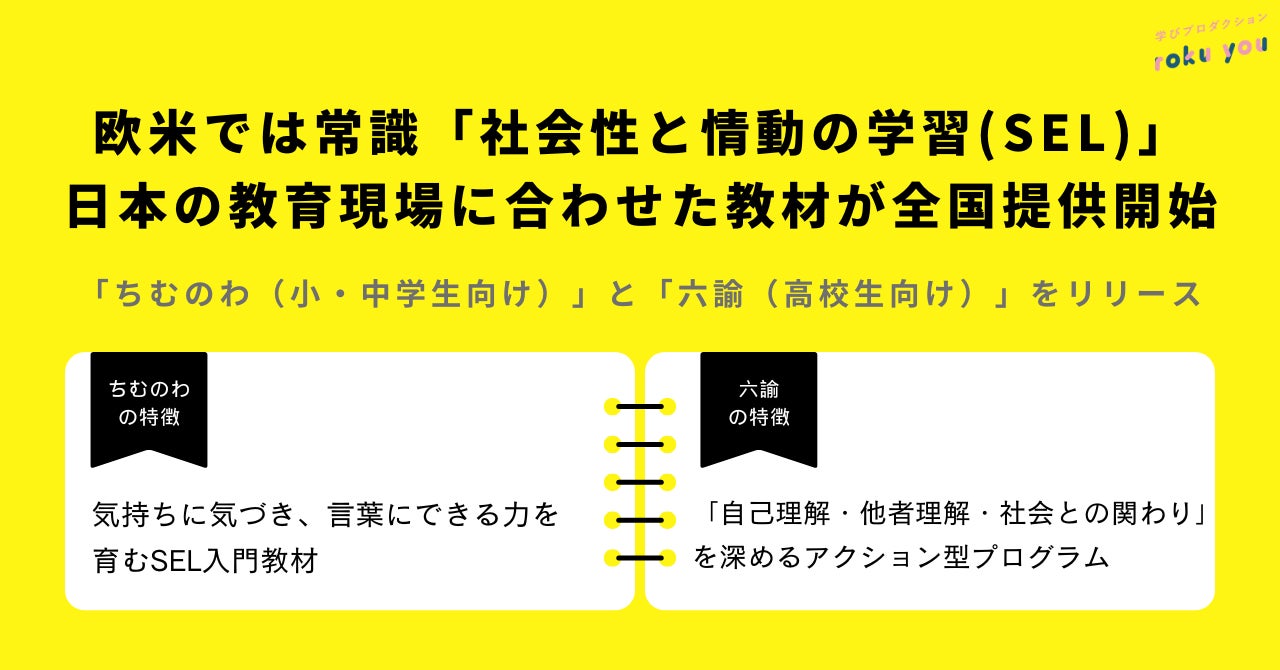 株式会社rokuyou(本社:沖縄県那覇市、代表取締役:下向依梨)は、SEL(Social Emotional Learning/社会性と情動の学び)を基盤とした新しい教育教材として、小・中学生向けプログラム「ちむのわ」と高校生向けプログラム「六諭」を2025年度より全国の学校に向けてリリースいたします。本プログラムは、これまでに全国120校・35,000名以上の児童生徒へのSEL教育導入実績を持つrokuyouが、学校現場での課題と成果の両面から開発した「次世代の学びのスタンダード」です。