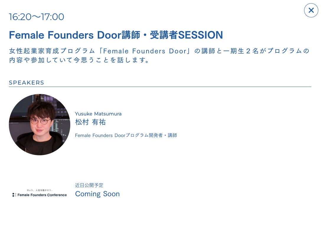 「Female Founders Conference 2025」当日は、「Female Founders Door」の講師である松村氏および受講生によるセッションをステージBの16時20分から予定しております。起業家育成プログラム「Female Founders Door」第2期への受講に興味がある方は是非この機会もお見逃しなく。