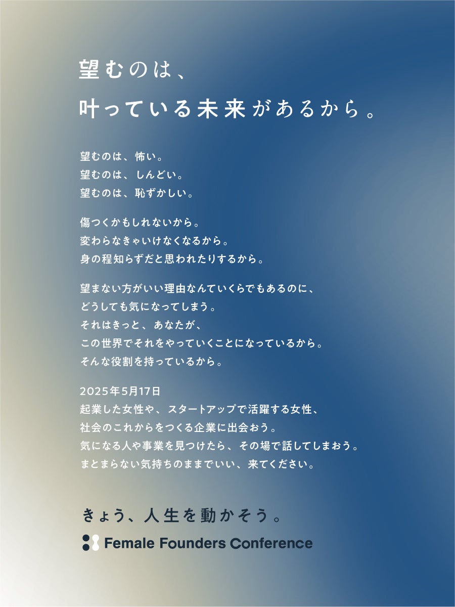 最前線で働く女性たちから仕事上で成果を出すために大切なことを学ぶ場や、自身のロールモデルとなる人が見つかる機会があったらいいなと思い、女性のためのキャリアイベント「Female Founders Conference 2025」を開催するに至りました。本イベントに参加したことをきっかけにして、皆様のキャリアを含めた人生が動き出す1日になることを願っております。