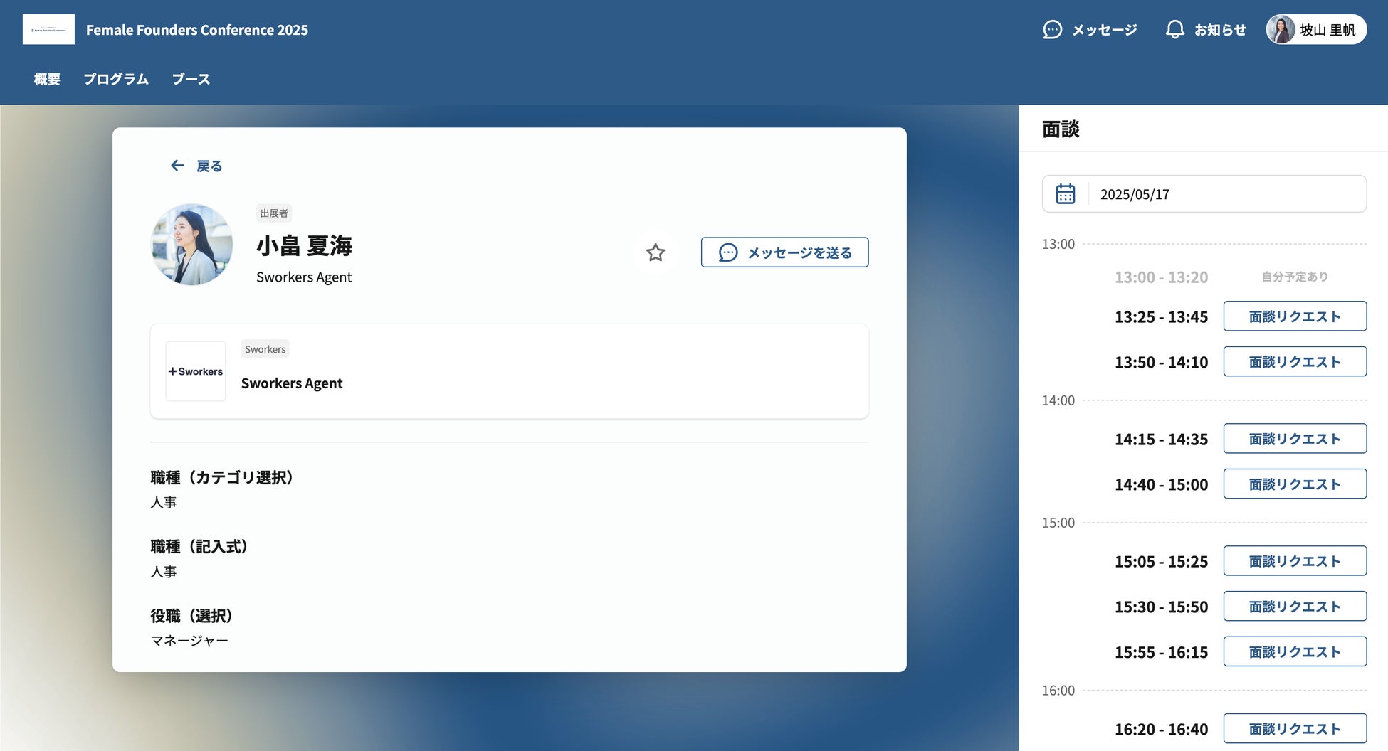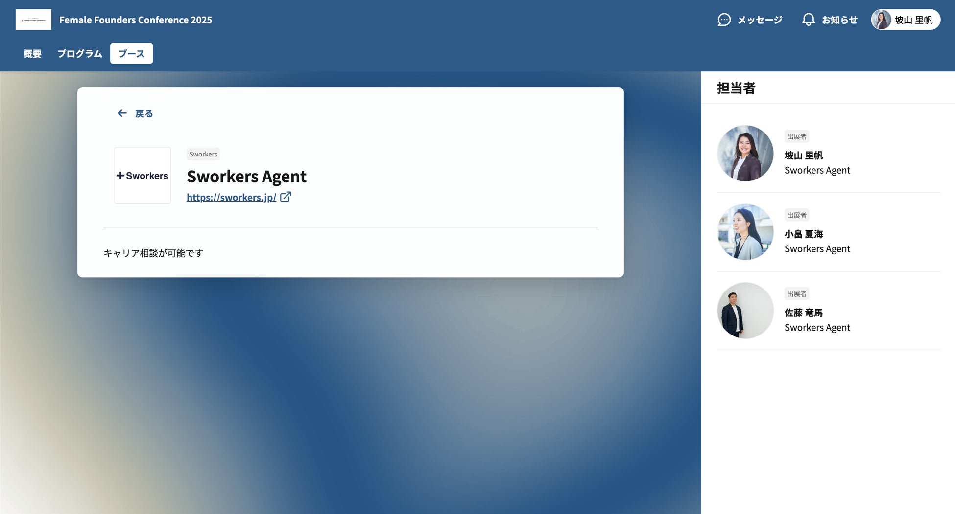 ▷登録方法について:「Female Founders Conference」への参加申し込みをしたのち、EventHubマイページ内の「ブース」タブから「Sworkers Agent」を検索し、担当者を選択したのちお好きな時間枠で面談予約をしてください。(※面談枠は先着順となります)