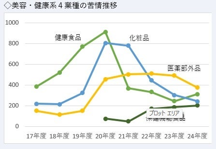 医薬部外品は2022年度から1位だったが、育毛剤やシミへの効果をうたったものなどが減少し、3位となった。美容健康商品はインターネット上の広告・表示を中心に2018年度ごろから苦情が増加し始め、コロナ下をピークに減少に転じていたが、医薬部外品についてはその後も著しく不適切な表示への苦情が続いていた。健康食品については今期、精力増強をうたう広告の性的表現に86件の苦情が寄せられ、4年ぶりに増加した。