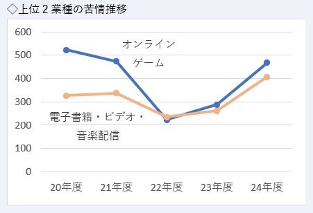 苦情の業種別件数では、1位オンラインゲーム、2位電子書籍・ビデオ・音楽配信、3位医薬部外品という順位になった。上位2業種は表現が不快だとする苦情が多数寄せられ、それぞれ前年比162.5%、155.0%と増加した。2022年度から1位だった医薬部外品は減少した。