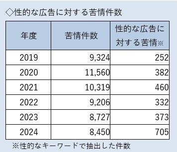性的・暴力的・猟奇的な表現については毎年苦情が寄せられるが、特に苦情の多い場合には、広告主に対し苦情件数や内容などを情報提供している。2024年度は性的な広告表現への苦情が増加したため、広告主4社(苦情件数144件)に情報提供を行い、業種として苦情の多かったオンラインゲーム、電子コミックの業界団体にも2025年4月に情報提供を行った。
