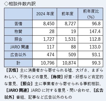 2024年度にJAROが受け付けた総数は10,796件(前年比99.3%)で、前年並みとなった。