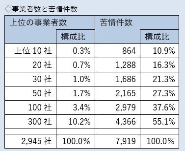 2024年度の苦情8,450件のうち、広告主が特定できた苦情(※)は7,919件で、これを広告主別に見ると2,945事業者になる(平均2.69件/事業者)。このうち、苦情の多い広告主上位50社(全事業者の1.7%)の苦情件数は2,165件(苦情全体の27.3%)だった。上位100社(3.4%)の苦情件数は2,979件(37.6%)、上位300社(10.2%)は4,366件(55.1%)。