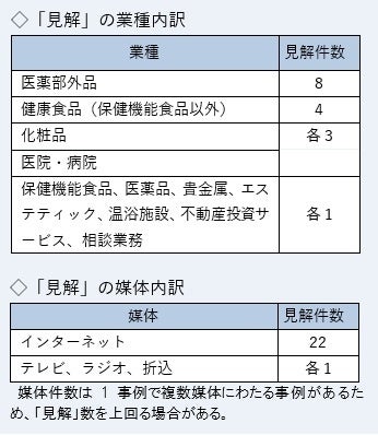 「見解」対象の媒体はインターネットが22件を占めた。インターネットが最も多い状況は2011年度から続いている。そのほかテレビCM、ラジオの生コマーシャルが1件ずつあった。