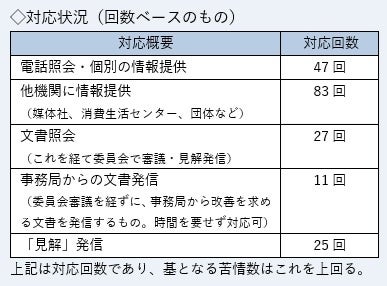 JAROでは苦情を基にさまざまな対応を行っている。2024年度は、広告主への情報提供を11回(苦情685件)行った。会員企業については会員専用ページを通じて当該社の苦情1,562件を情報提供した。業務委員会および分科会で審議した結果である「見解」発信は25回(24社)、委員会審議を経ずに事務局から出される文書発信は11回(11社)などとなった。(見解発信の詳細は次ページ)