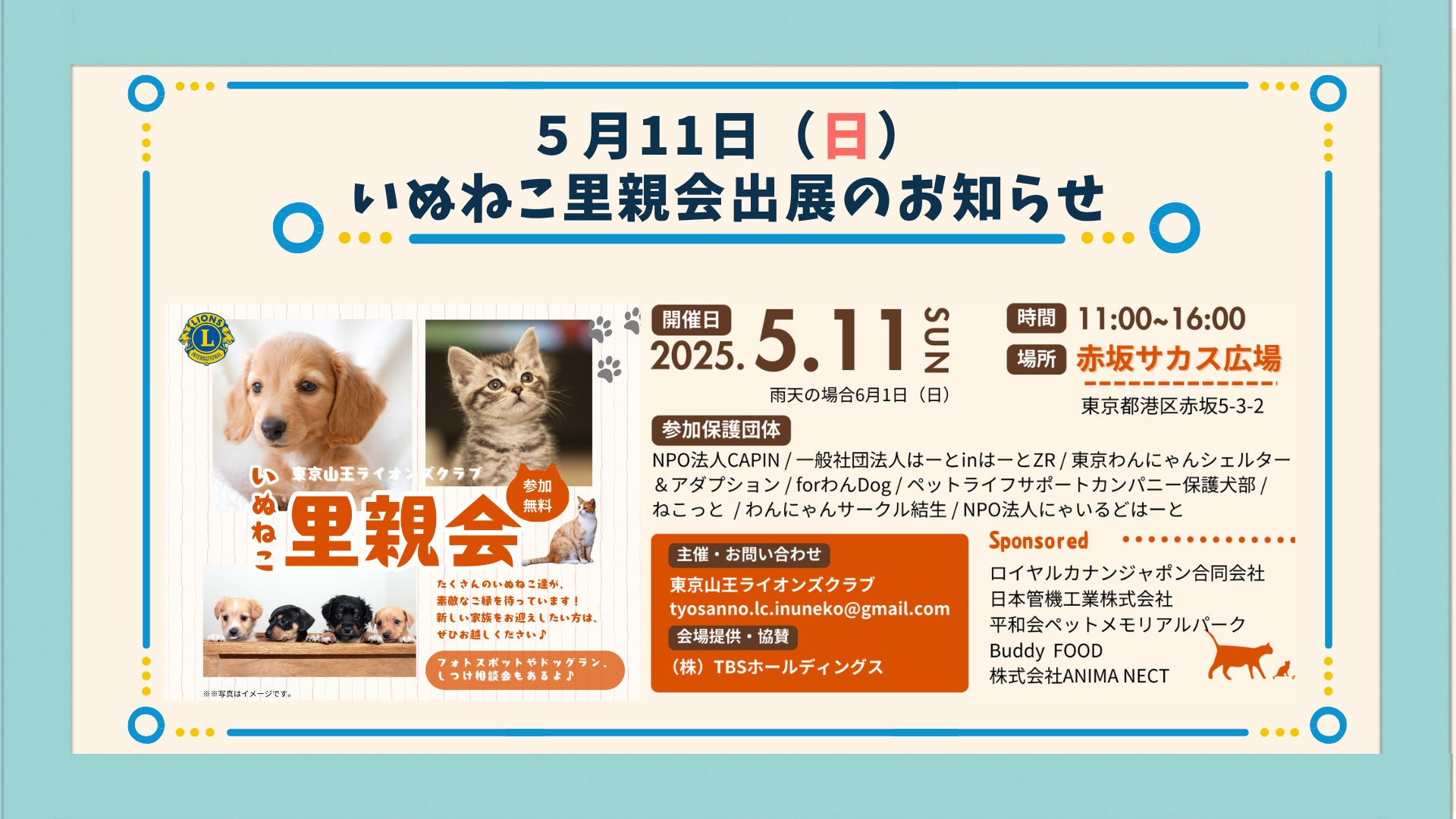 このたび、2025年5月11日(日)に赤坂サカス広場で開催される「いぬねこ里親会」にて、無料相談会と支援型イベントを出展いたします。