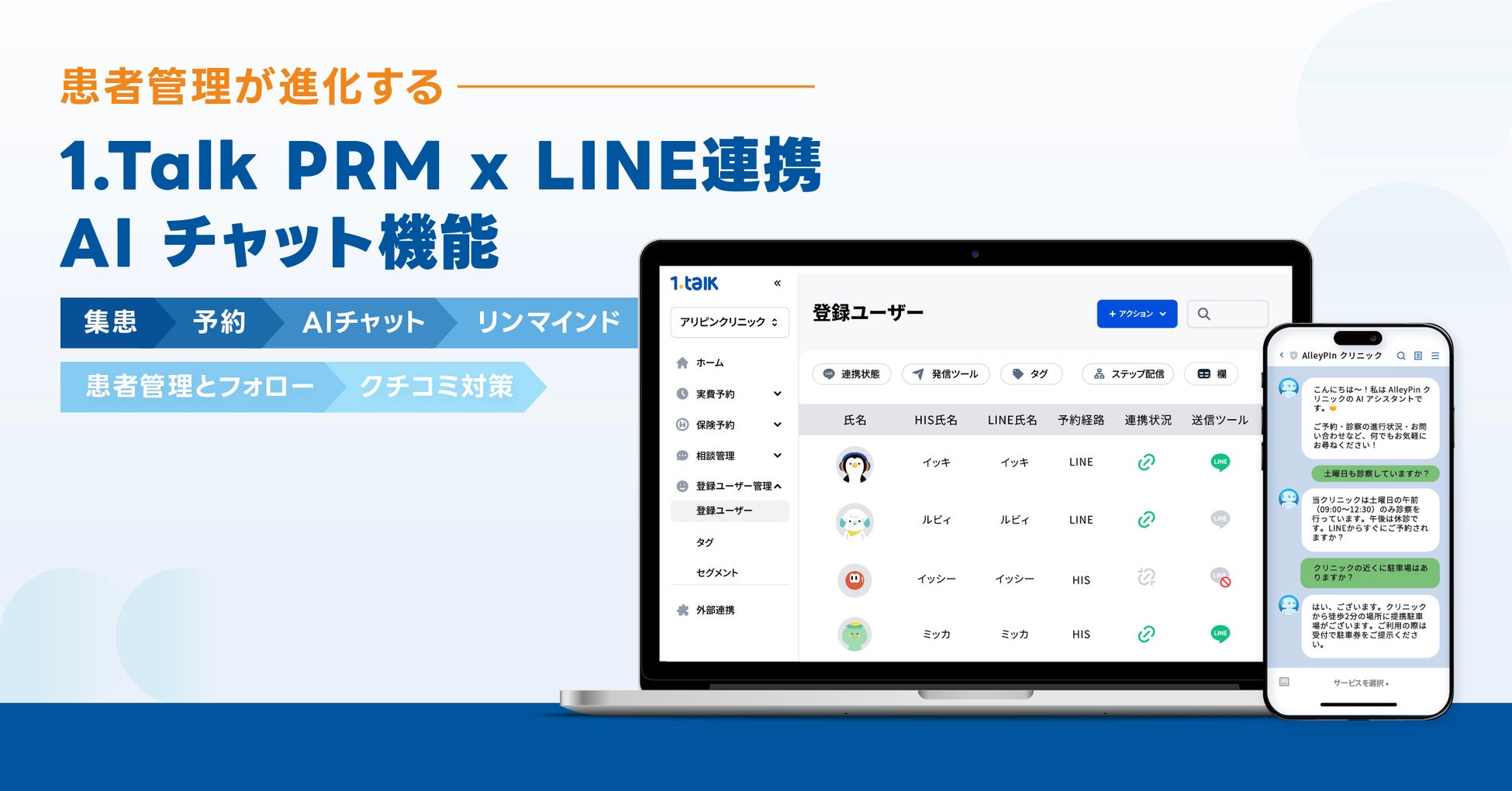 AlleyPin(アリピン)は、2017 年に設立された医療分野に特化した MedTech サービスプロバイダーです。当社が提供する患者関係管理システム「1.Talk(ワン・トーク)」は、LINE の技術パートナーとして、内科・歯科・美容医療など多様な診療科目において導入され、これまでに 1,800 以上のクリニックでの実績を有しています。