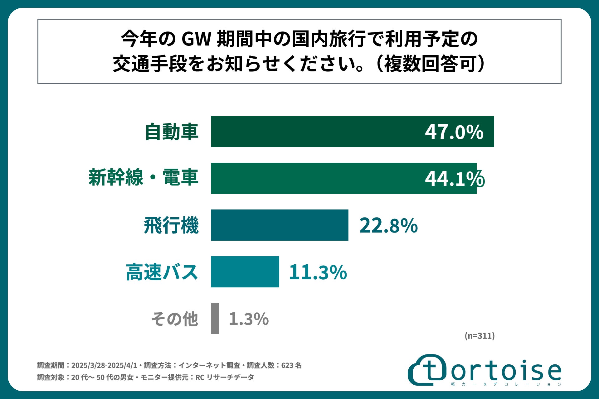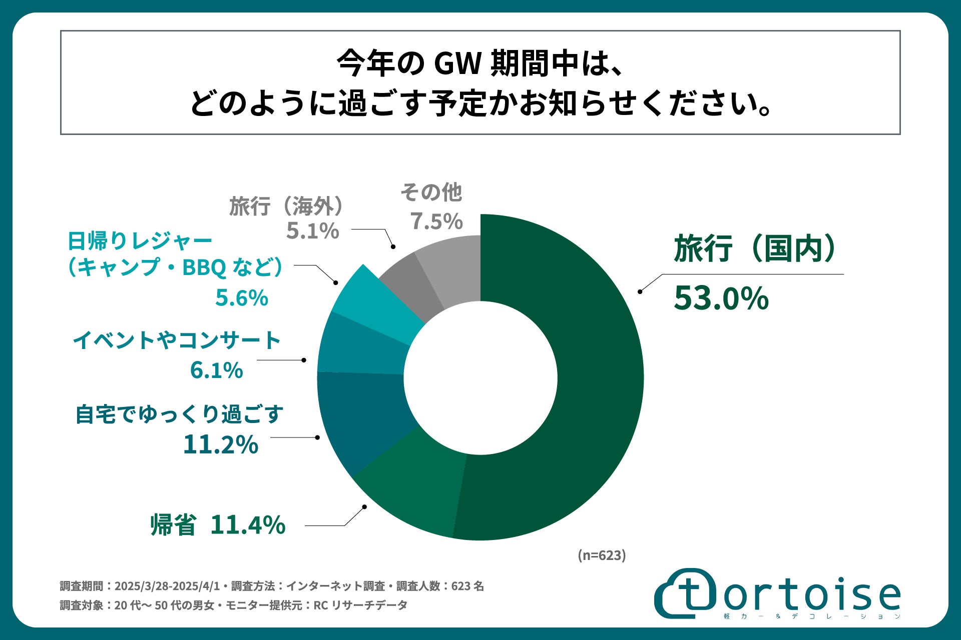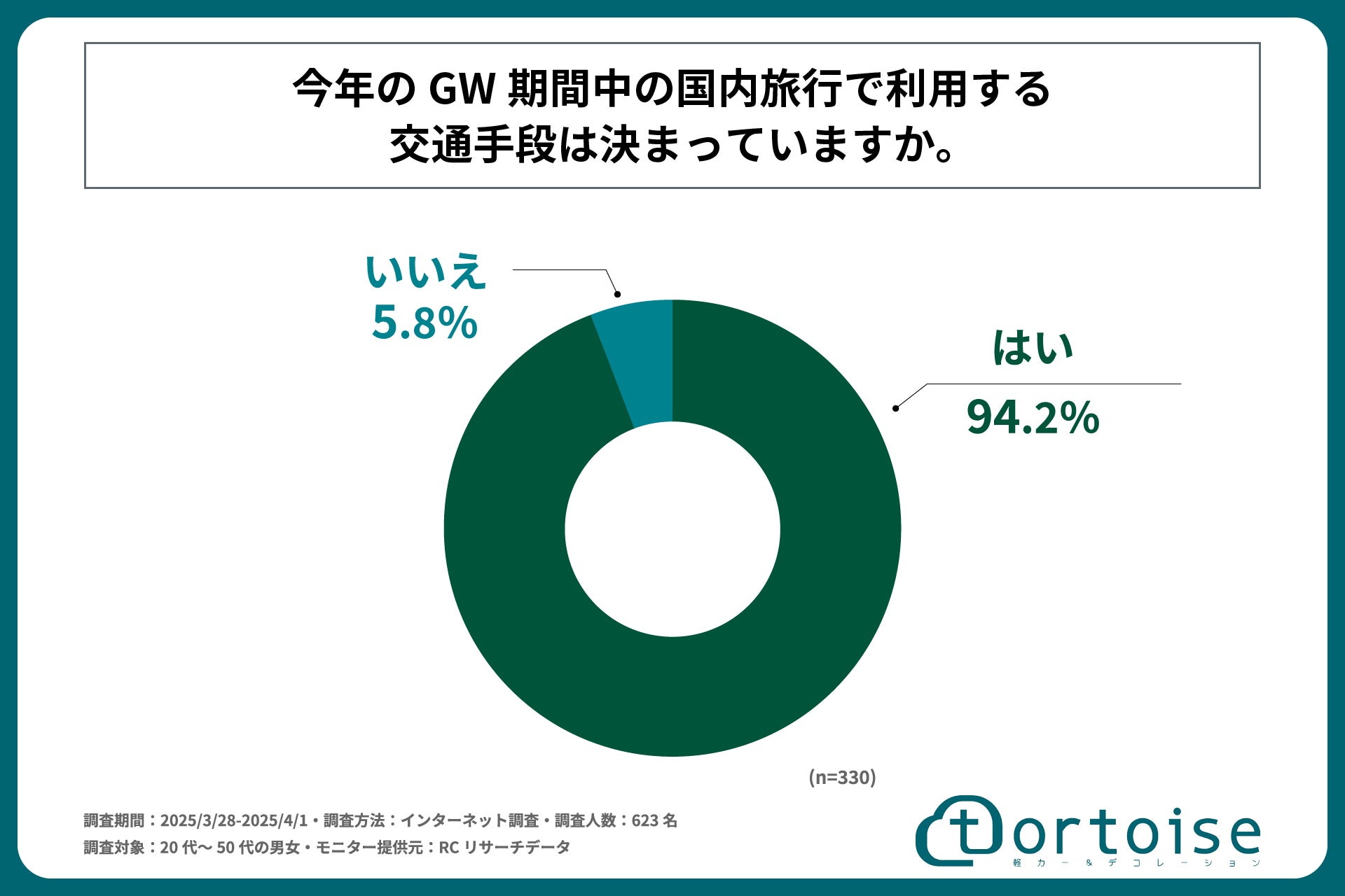 株式会社トータス(本社:神奈川県大和市、代表取締役:村野 公紀)が運営する「tortoise」は、20代~50代の男女を対象に「GW期間中の国内旅行と交通手段に関する調査」を実施しました。この調査結果から、20代~50代の男女の今年のGWの国内旅行の予定や、旅行で使用する予定の予算や交通手段などが明らかになりました。
