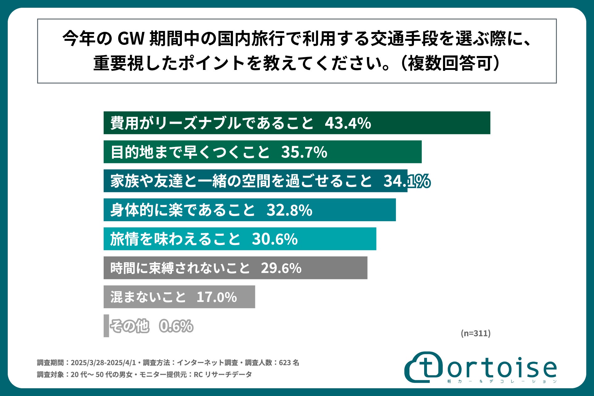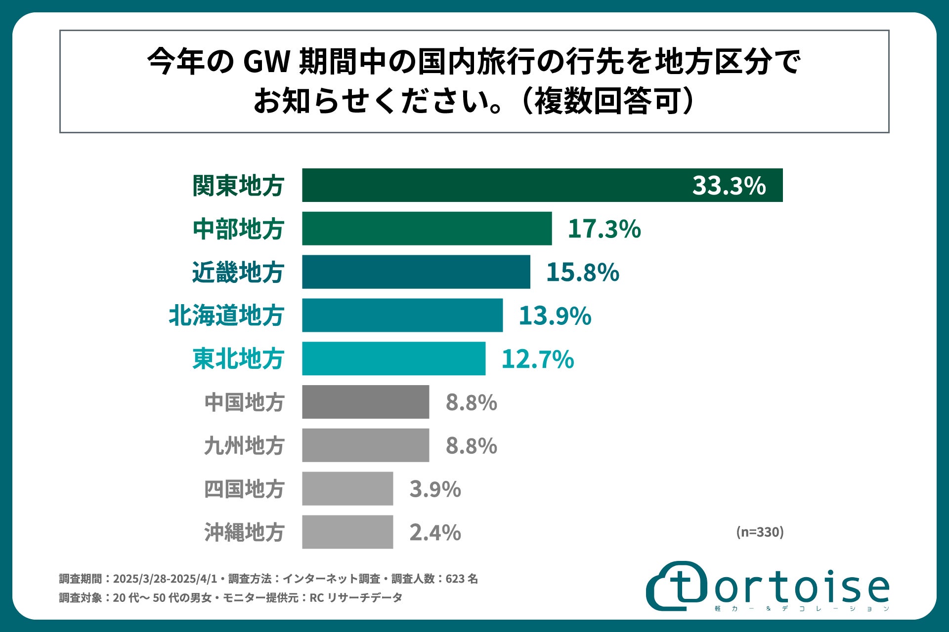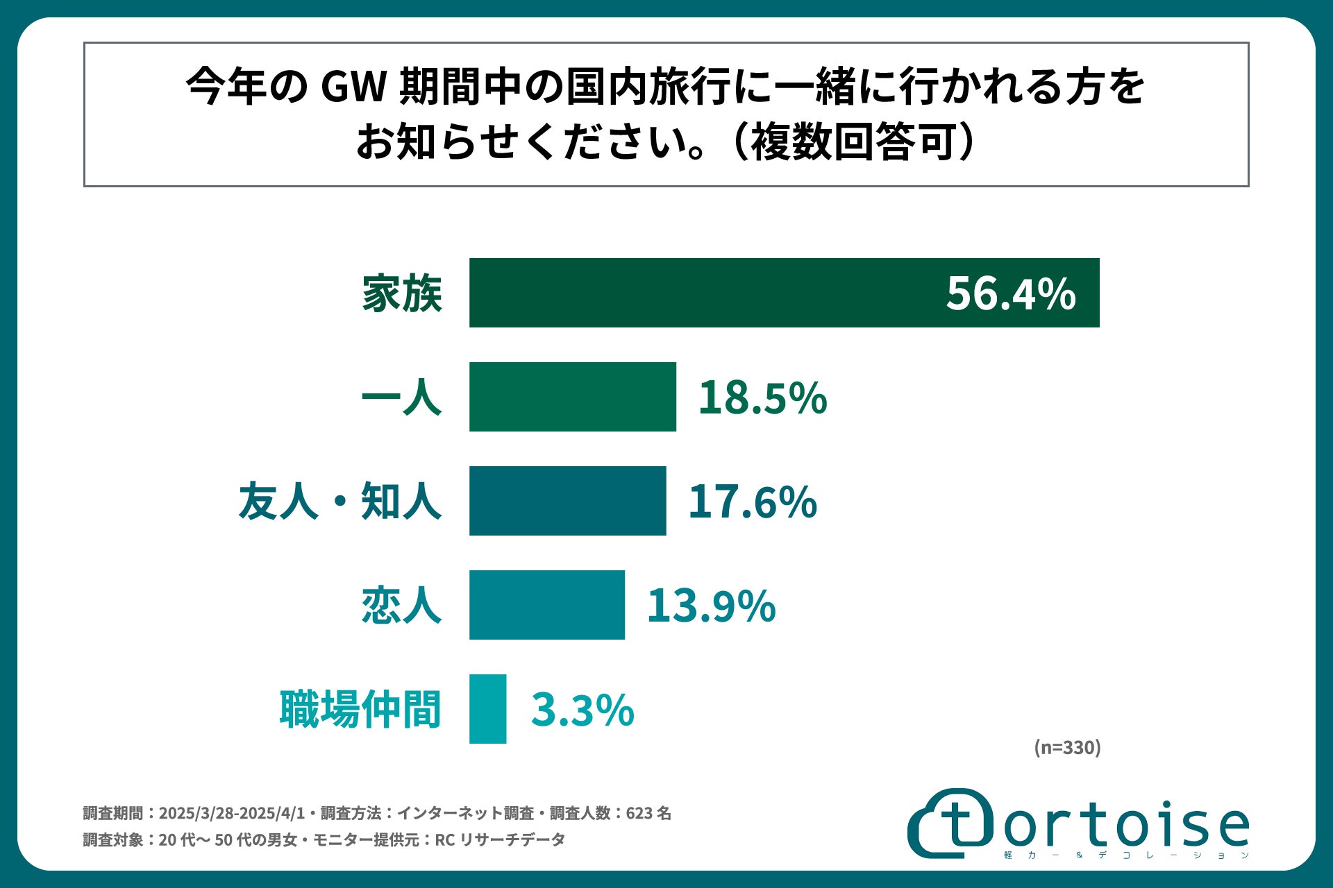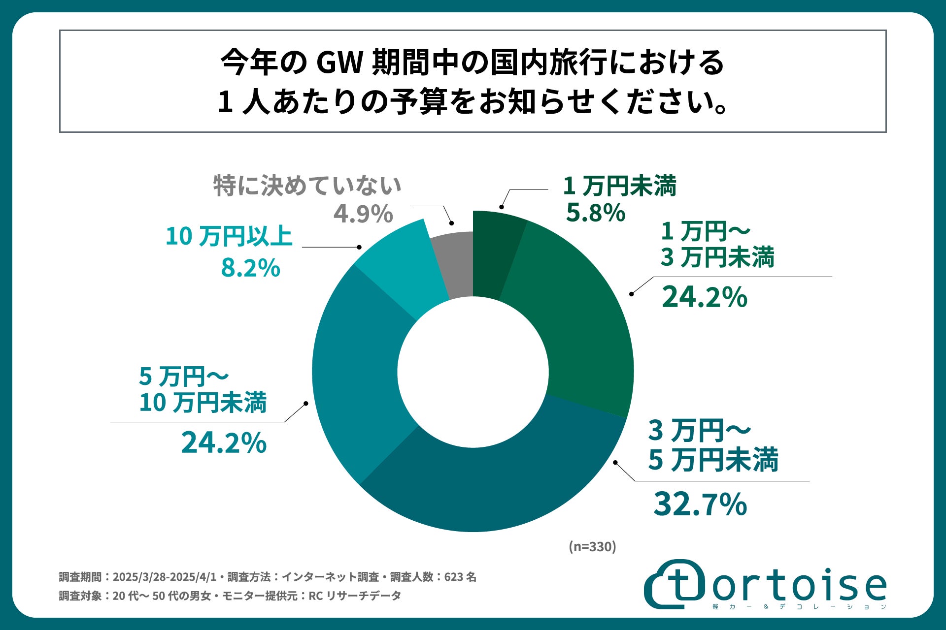 株式会社トータス(本社:神奈川県大和市、代表取締役:村野 公紀)が運営する「tortoise」は、20代~50代の男女を対象に「GW期間中の国内旅行と交通手段に関する調査」を実施しました。この調査結果から、20代~50代の男女の今年のGWの国内旅行の予定や、旅行で使用する予定の予算や交通手段などが明らかになりました。