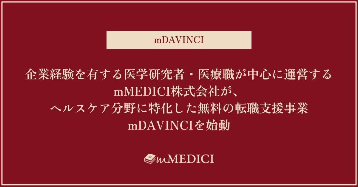 医学研究者・医療職などヘルスケアスペシャリストによって設立され、一流の知のプラットフォームを提供しているmMEDICI株式会社(代表取締役:廣瀬 直紀、以下「当社」)は、2025年1月よりヘルスケア人材の企業転職支援事業mDAVINCIを始動します。