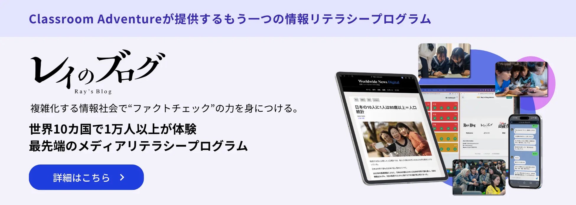 株式会社Classroom Adventureは慶應義塾大学の現役学生が立ち上げたEdtechスタートアップです。誤情報・偽情報をテーマにした情報リテラシープログラム「レイのブログ」は世界10カ国で20000人以上が体験。2024年からファクトチェック世界大会「Youth Verification Challenge」も米Google社より引き継ぎ主催。ゲーミフィケーションを活用した「楽しすぎる」学びを作ります。 2024年には朝日新聞社大学SDGs Action! Awards グランプリ、東京都主催国内最大級のスタートアップコンテストTOKYO STARTUP GATEWAY 2024最優秀賞。 総務省「デジタル空間における情報流通の健全性確保の在り方に関する検討会」やGoogle Trusted Media Summit 2023など情報リテラシー分野で国際的な実績多数。