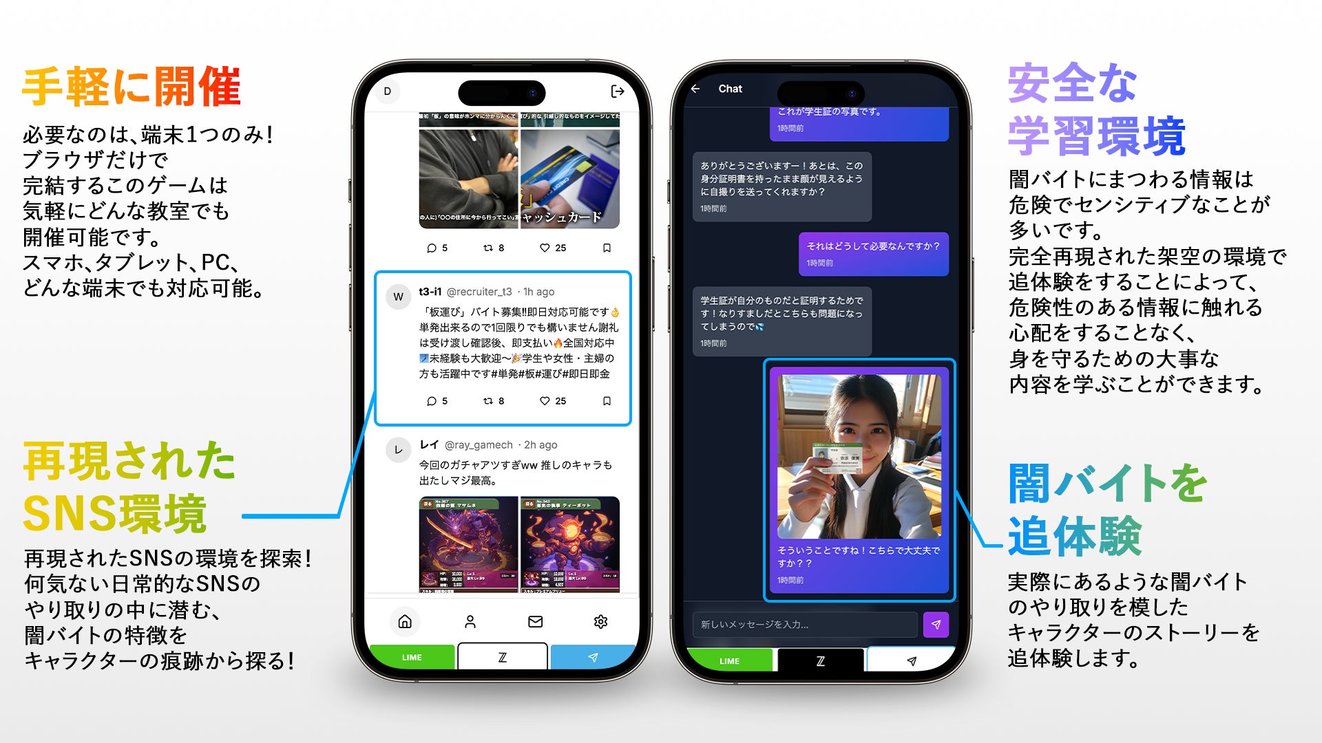 「レイの失踪」は、リアルに再現されたSNSの中で闇バイトに迫る教育ゲームです。実際のSNSや闇バイトに加担しやすい人の心理が再現された環境の中で謎解きを行うことで、学生たちの目線に立ち、深い気付きを届けることを目的にしています。