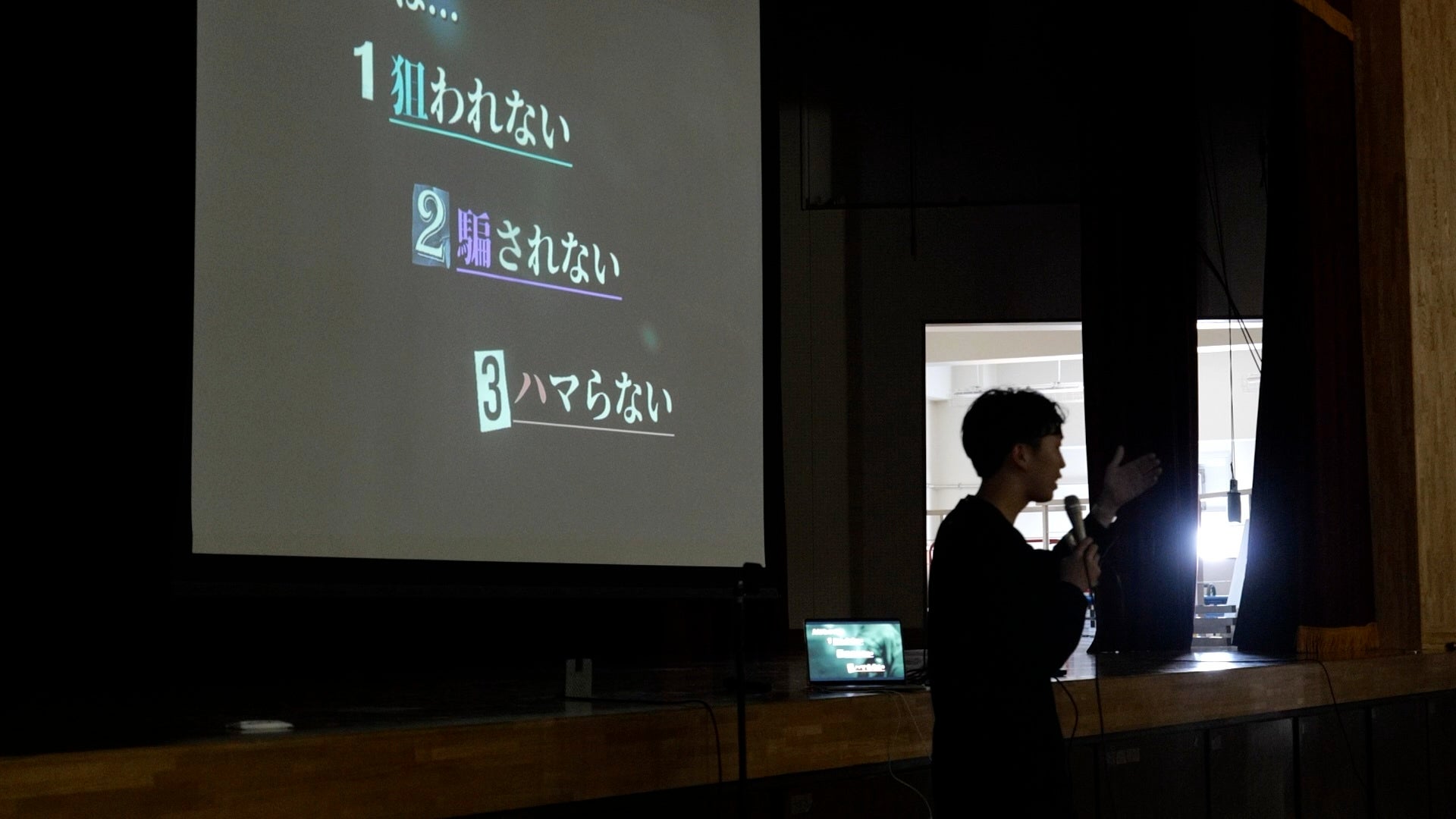 プログラムは2部構成で展開されました。まず生徒たちがゲームを通じて闇バイトを疑似体験し、その後警視庁の担当者より実際の事例や対処法についてのレッスンを受けるという流れです。