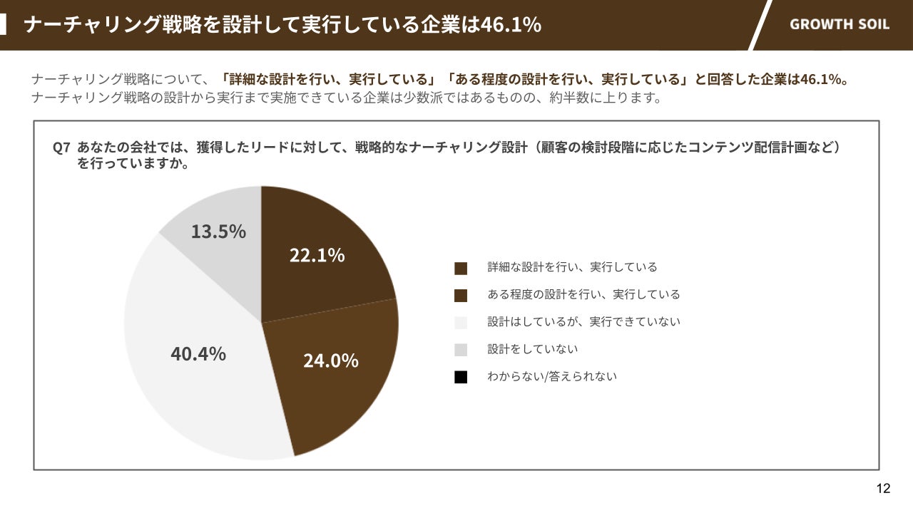 一方で、戦略的なナーチャリング設計については、「設計はしているが実行できていない」が4割を占めました。