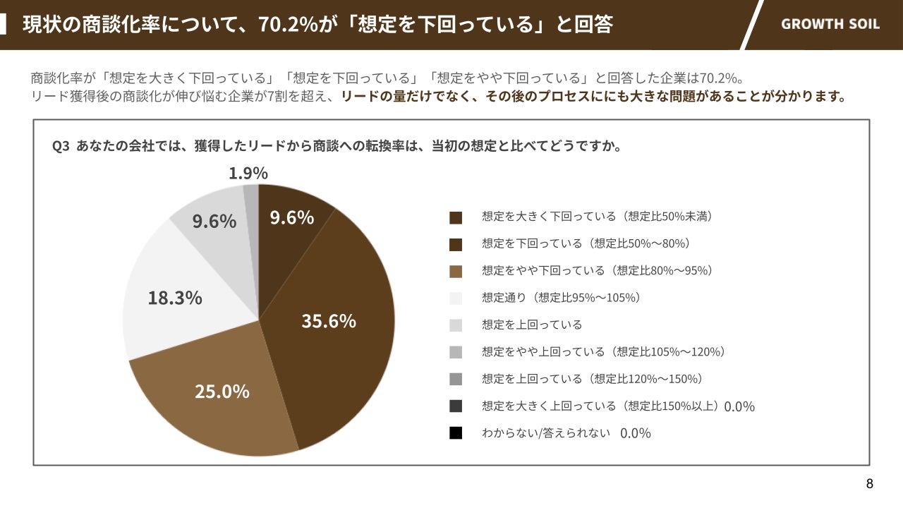 ■商談転換率が「想定を下回る」と回答した企業は70.2%。リード獲得後の課題が浮き彫りに