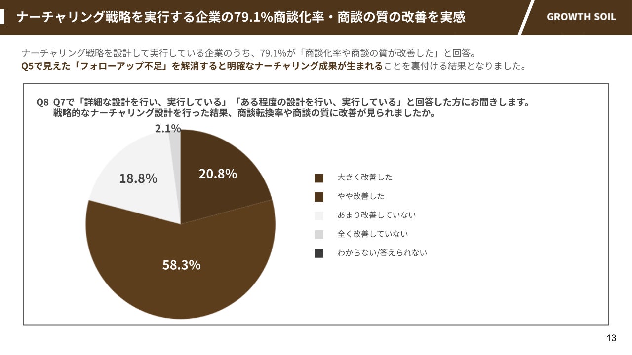 この調査では、「戦略的なナーチャリング設計を実行できている企業の約8割が商談転換率やリードの質の改善を実感している」という興味深いデータも。ナーチャリング戦略を適切に実行できれば、明確なナーチャリング成果を生み出せることを裏付ける結果となりました。
