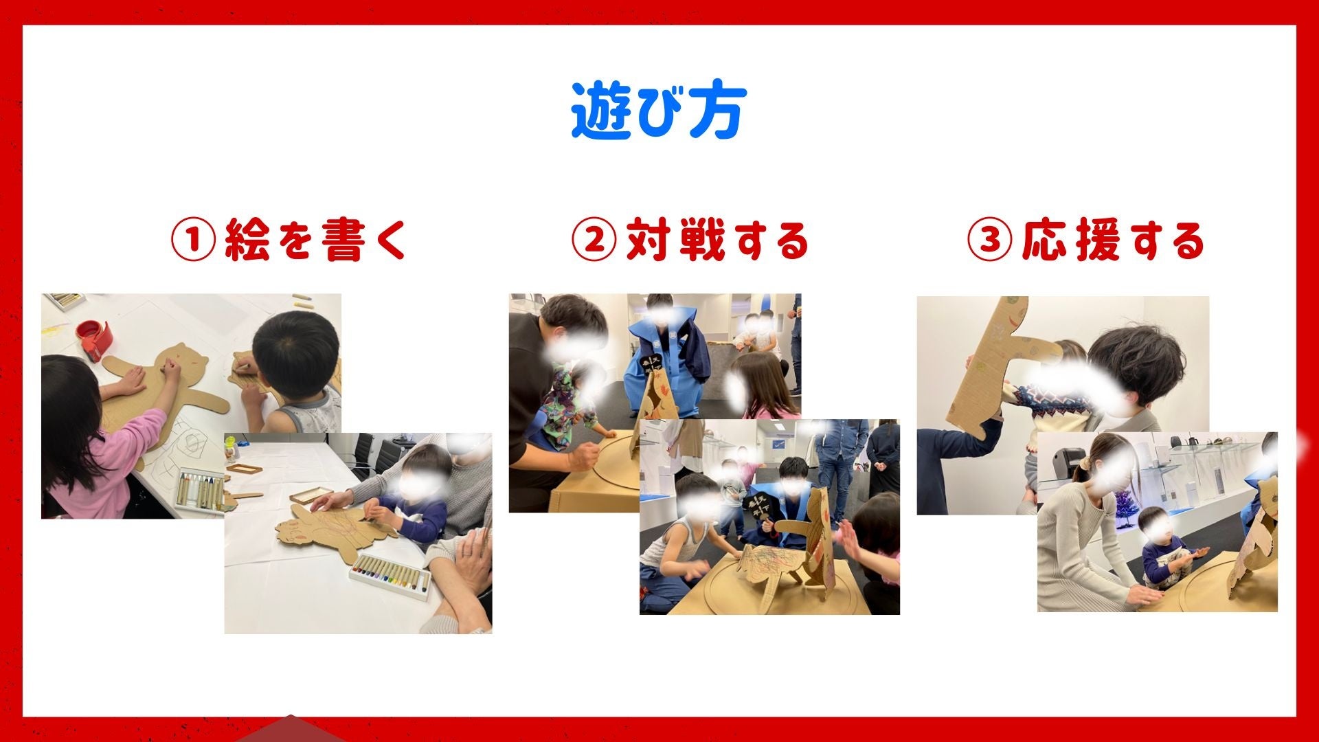 お子様や海外の方々などのお客様が、力士に絵を書きます。創造力を働かせ、思い思いに表現する力士は、非常にユニークで、毎回唯一無二の力士が誕生します。またご自身で絵を書いたからこそ、対戦意欲が掻き立てられ、イベントが盛り上がります。