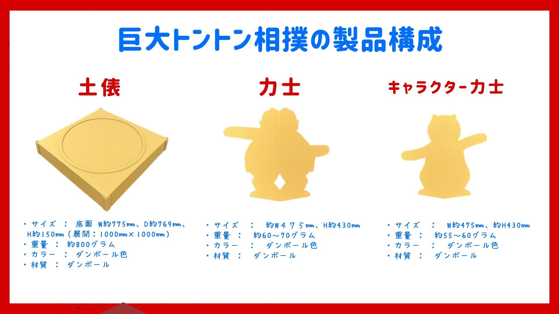 「巨大トントン相撲」の主な製品構成・サイズ感は?
