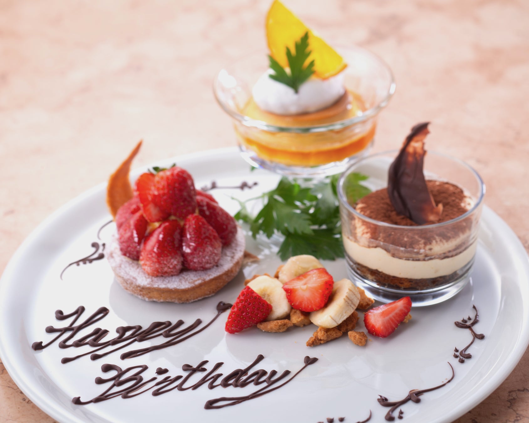大切な日を彩る、オリジナルメッセージ入りデザートプレート。フルーツやミニドルチェを盛り合わせ、特別なひとときを華やかに演出します。誕生日や、結婚記念日など、メッセージは自由にカスタマイズ可能です。