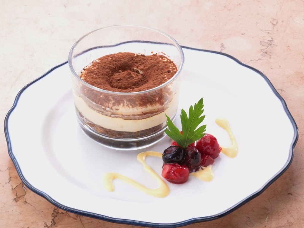 マスカルポーネクリームとエスプレッソを染み込ませたスポンジの層が絶妙に絡む、クラシカルスタイルのティラミス。口に入れた瞬間とろける、贅沢な口どけ。