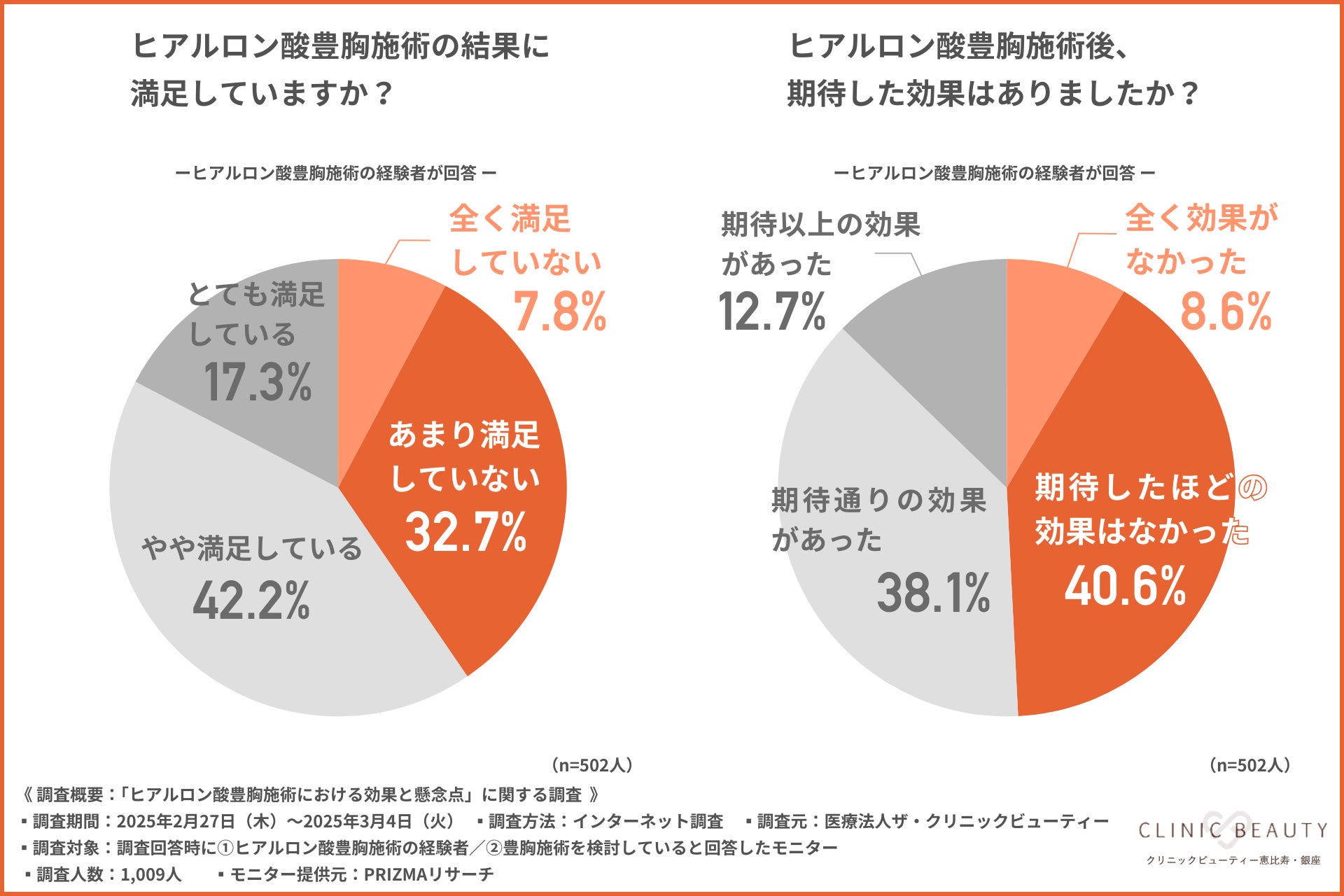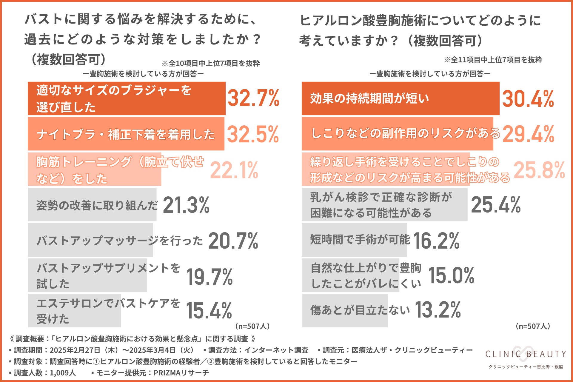 そこで今回、医療法人ザ・クリニックビューティー(https://the-clinic-beauty.com/)は、①ヒアルロン酸豊胸施術の経験者/②豊胸施術(通称:豊胸手術)を検討している方を対象に、「ヒアルロン酸豊胸施術における効果と懸念点」に関する調査を行いました。