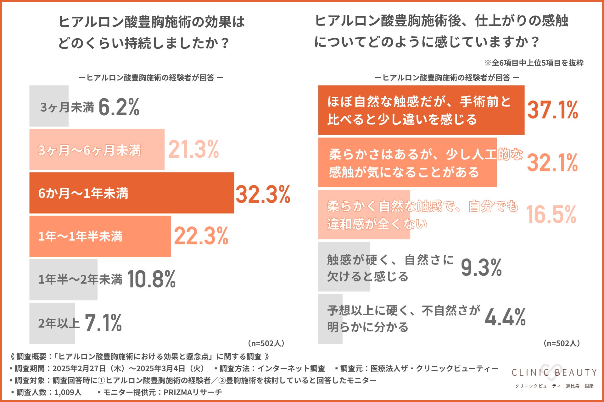 ヒアルロン酸豊胸施術の持続期間は「6か月〜1年未満」が最多で比較的短く、仕上がりの触感についても自然な感触を実感している方は多いものの、施術前との違いや人工的な触感を感じている方もいるようです。