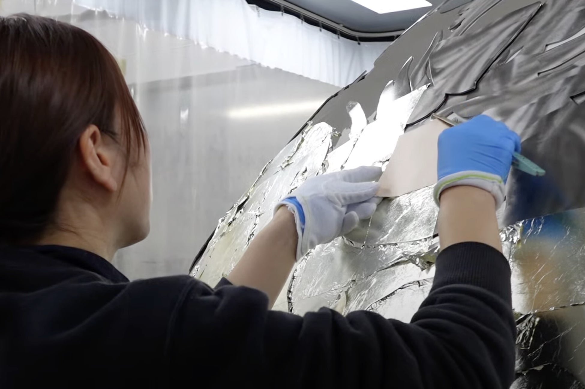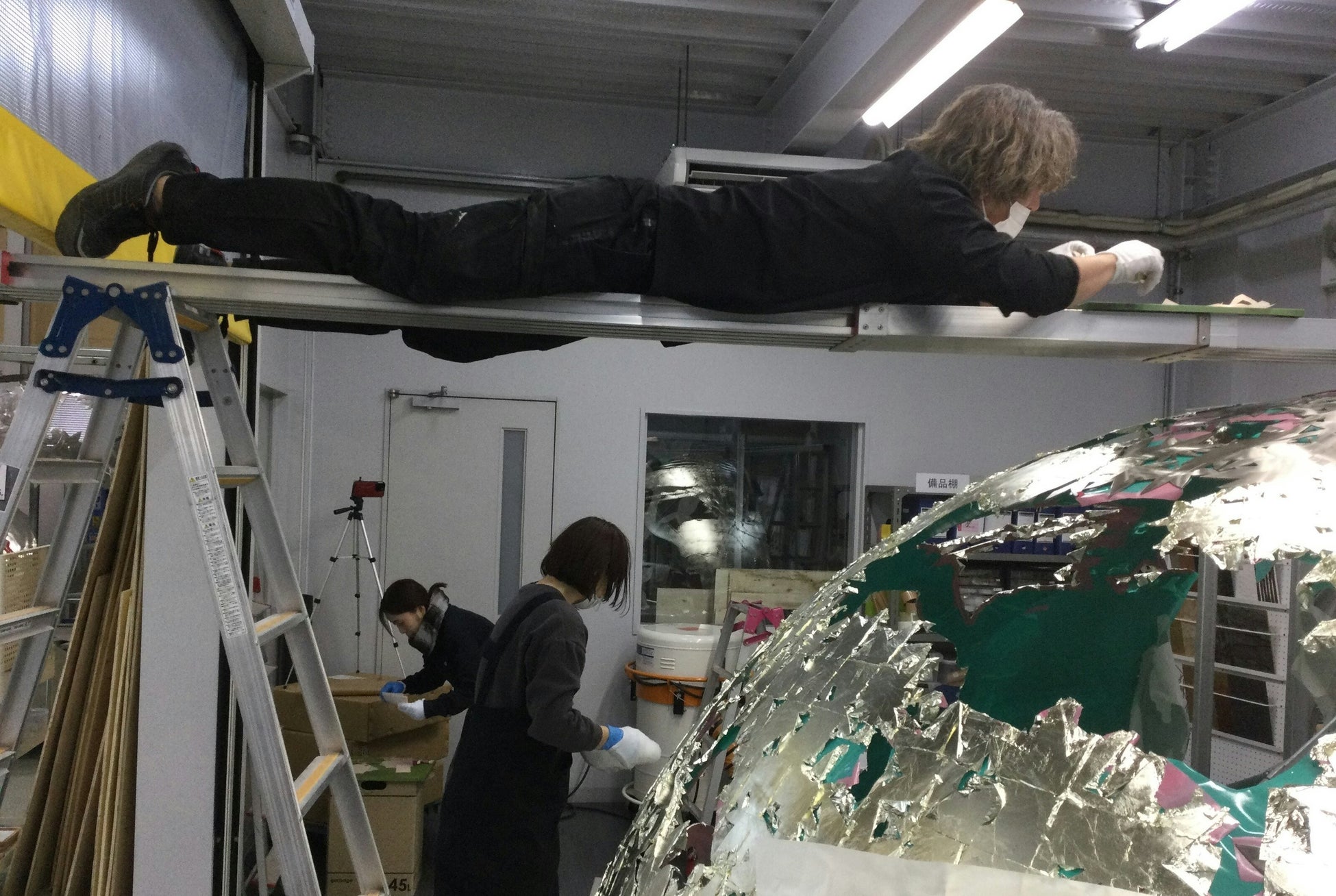 本プロジェクトでは、演出のみならず“素材そのもの”にもこだわりが込められており、環境配慮とクラフトマンシ ップの融合が求められました。そうした中、河森氏が当社の工場を視察され、金箔の製造工程と装飾技術をご 覧いただいたことをきっかけに、象徴的なオブジェへの金箔装飾が採用されることとなりました。