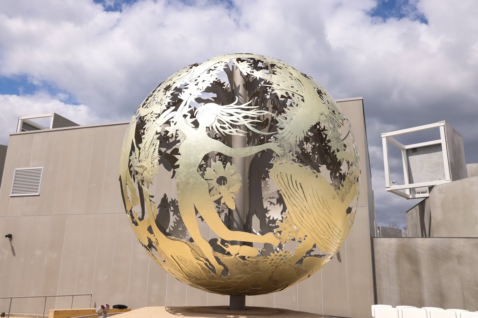 金箔はもともと、素材を無駄なく使う日本の伝統工芸であり、サステナブルな価値観を内包しています。今回は、 リサイクルされた金・銀から箔一の伝統工芸士が金箔を製造し、その繊細な箔を 3.5 メートルの大型オブジェ「い のち球」の外装に施しました。