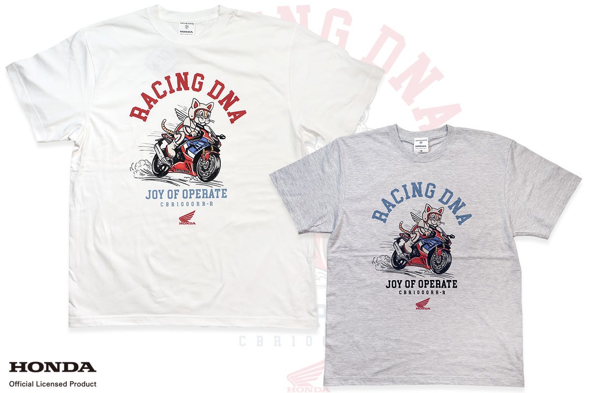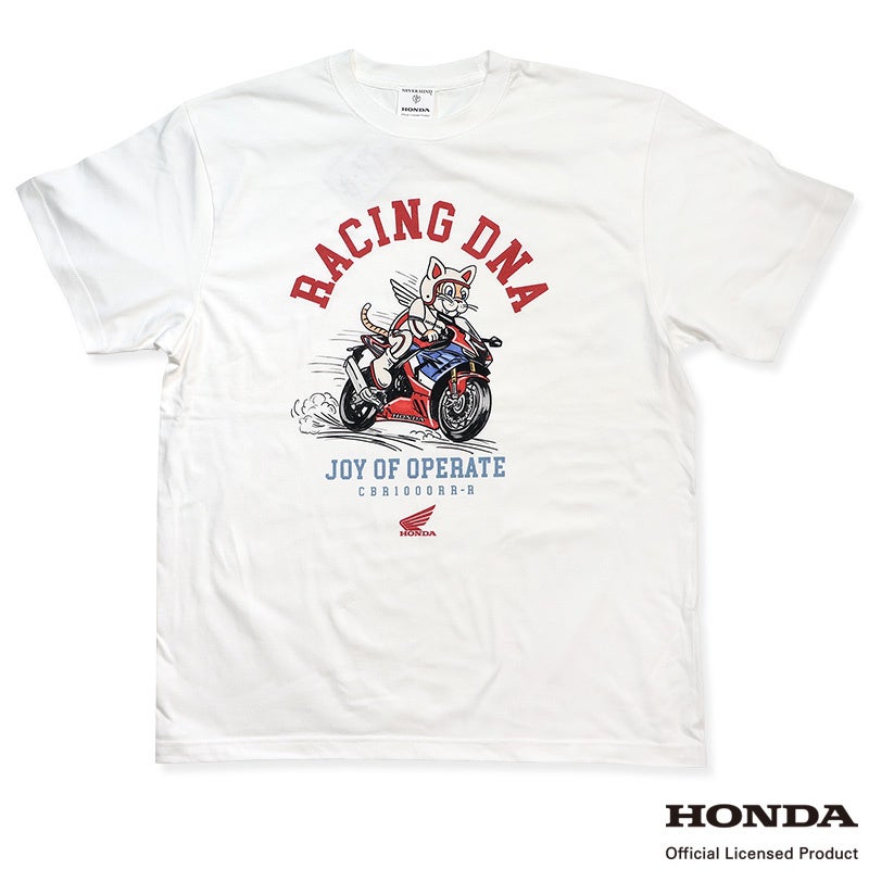 HONDA WINGのように翼が生えたレーサーキャットがサーキットを駆け抜けるヴィンテージでカレッジライクな可愛いデザインがポイントのこの夏ぴったりなリラックスシルエットのT-SHIRTS。