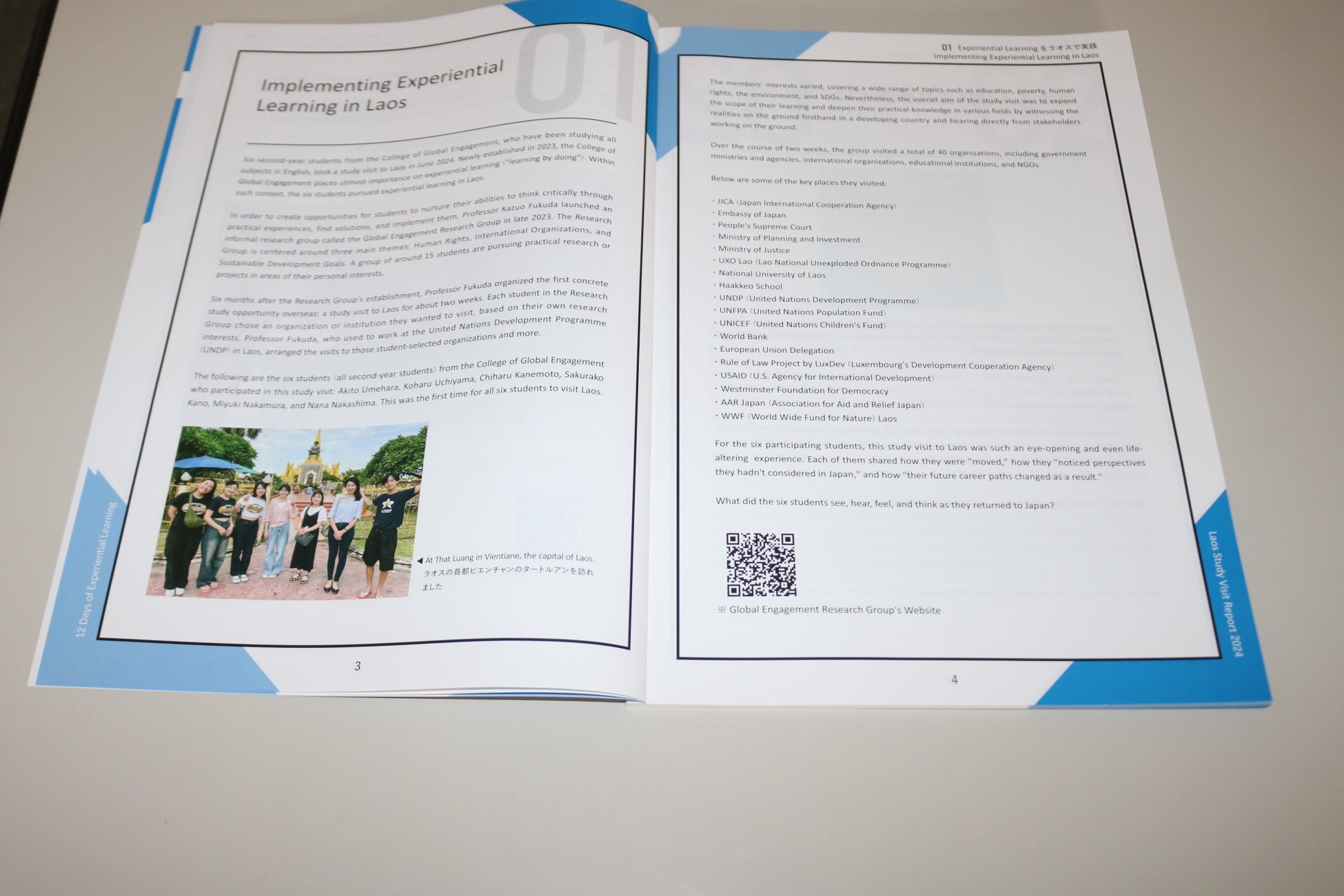 国際共生学部の2年生(現在3年生)が2024年6月、ラオスで取り組んだ「Experiential Learning」をまとめた「12 Days of Experiential Learning/Laos Study Visit Report 2024」が完成しました。スタディービジットに参加した5人の学生が、それぞれの体験や体験から学んだこと、考えたことをまとめた報告書です。