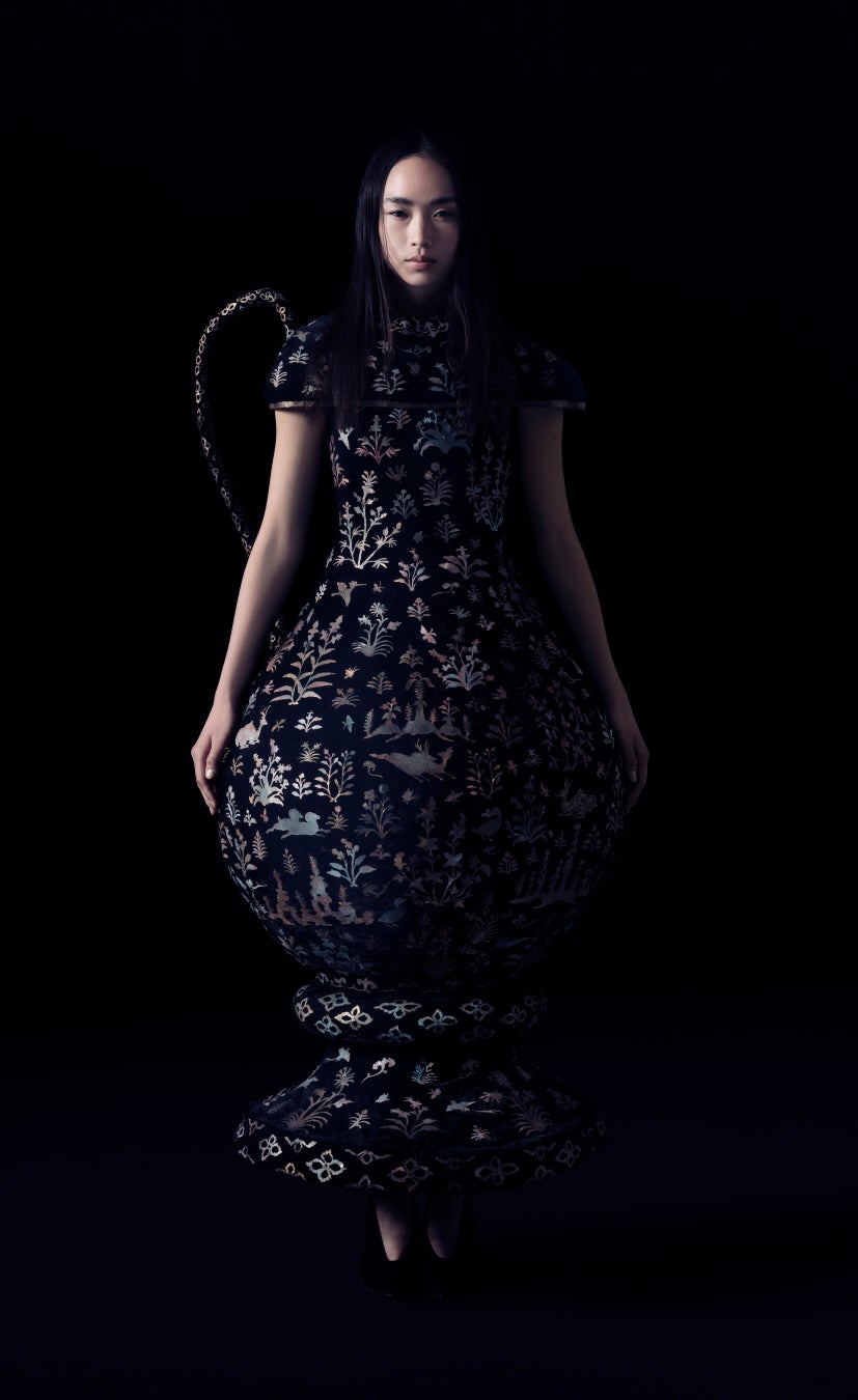動植物、昆虫など生き生きと繊細に刻まれた文様をなぞり、現代のファッションとしてよみがえらせました。