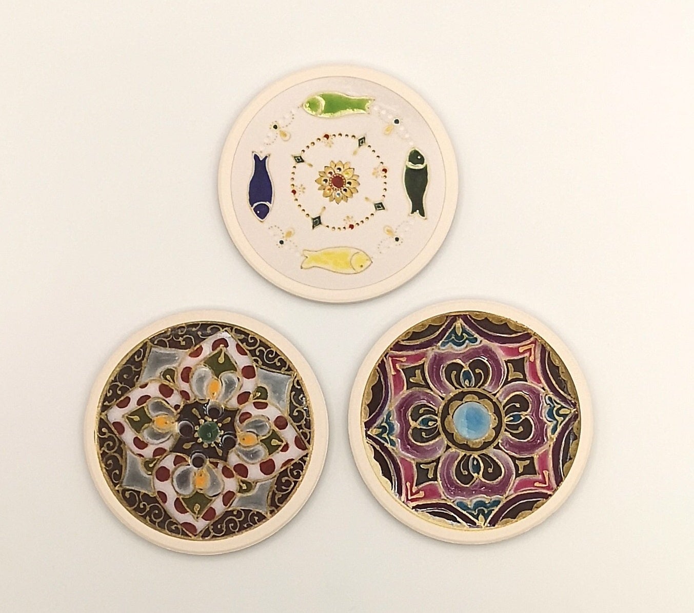 亀江さんが本展のために創作したプレートやブローチのモチーフをコースターにアレンジしました。