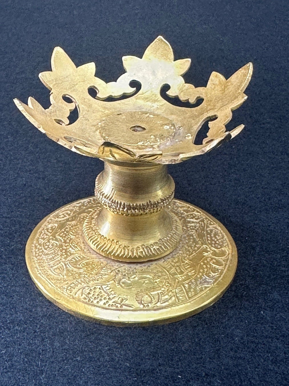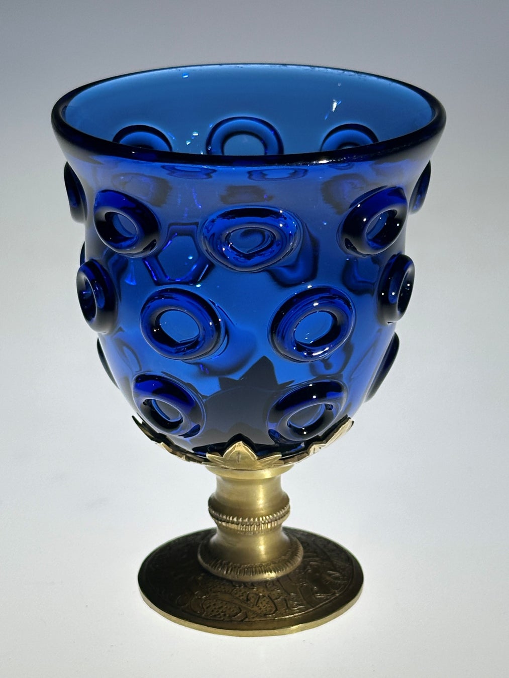 輪飾りが付いたコバルトブルーのグラスを、銀製の台脚で支える「瑠璃坏」。グラス部分は西方で作られ、台脚は中国で付けられた、東西の文化の融合を示す品と言われています。正倉院宝物の実物は、グラスを載せる「受け座」が明治時代の修理で当初のものから変わっており、また、台脚の銀の上に施されている金の鍍金(めっき)がほとんど見えなくなっています。今回はレプリカ作成にあたって、後に発見された受け座の形を模して、台脚を製作。さらに、台脚の全体に金鍍金をほどこし、1300年前の姿を表現しました。ガラス工芸家の迫田岳臣氏と金属造形家の田中均氏との合作です。