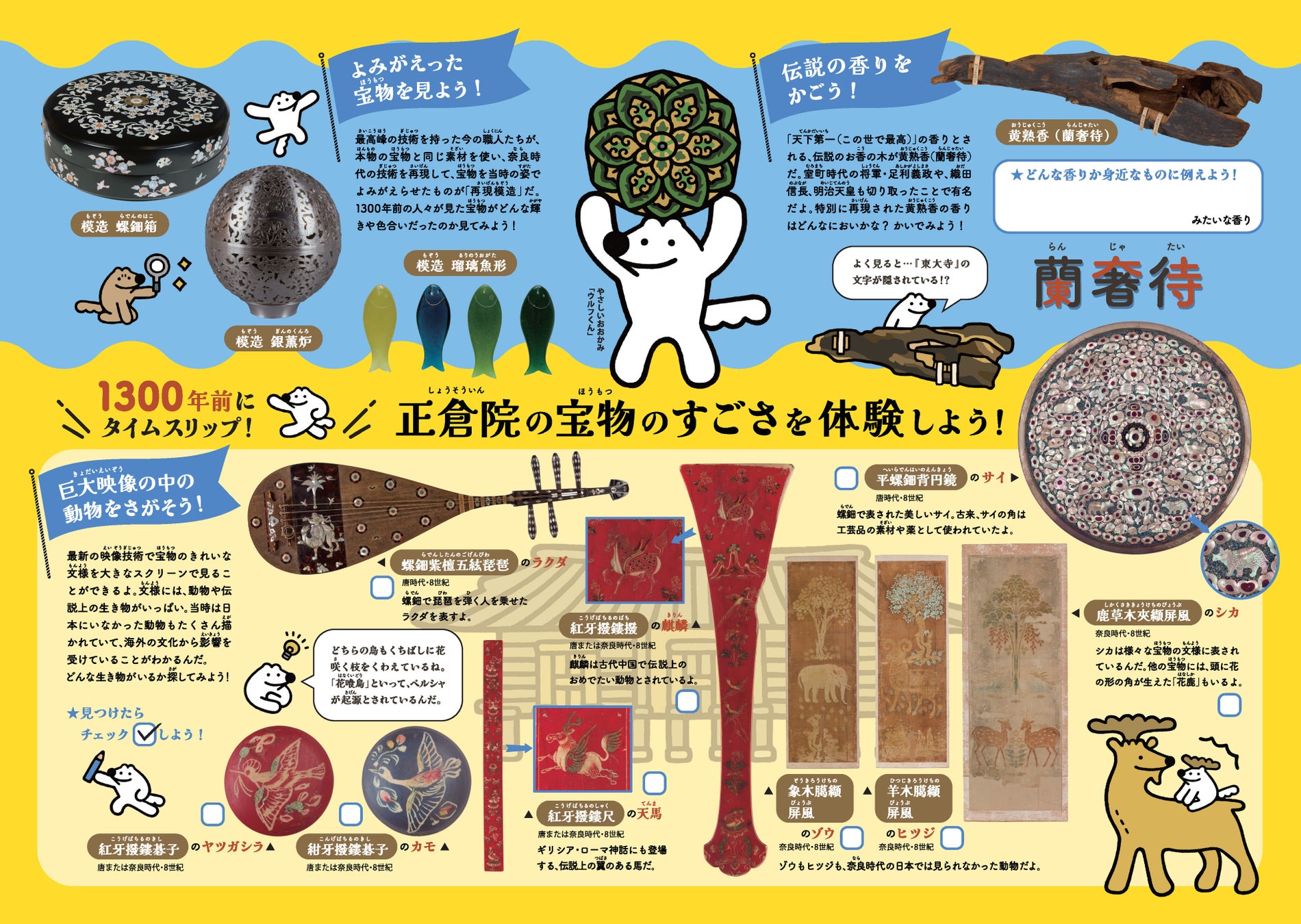「正倉院 THE SHOW」と、イラストレーターの本間あきらさんによる「やさしいおおかみウルフくん」とのコラボで、アクリルスタンドやステッカー、Tシャツなどのグッズが登場しました。また、かわいいイラストいっぱいの鑑賞ワークシートも完成。展示とあわせてお楽しみいただけます。