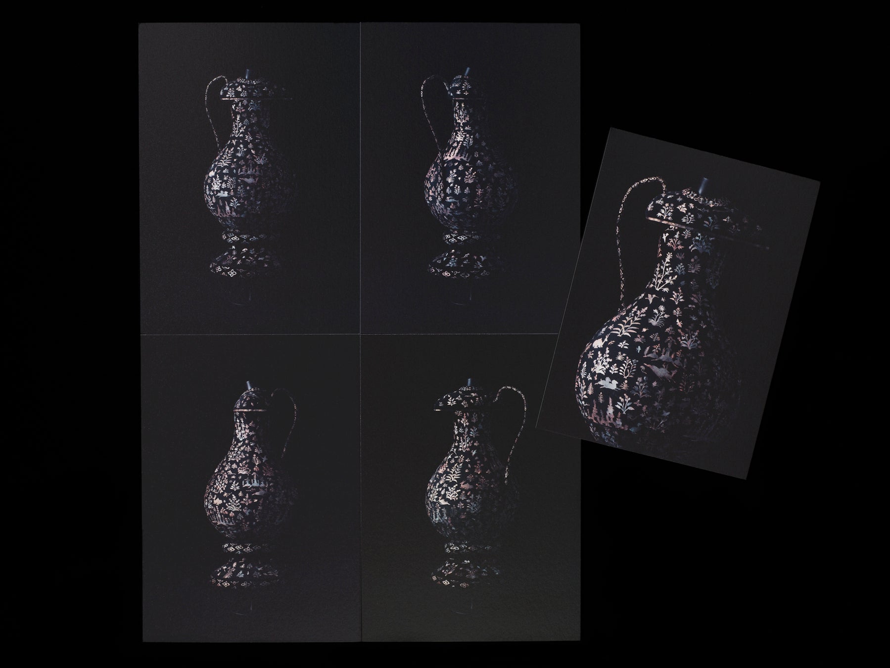 篠原さん創作のドレスを4方向から撮影したカットに文様のアップを加えた5枚で構成。「作品のかけらをお持ち帰りいただきたい」と、篠原さんご自身でデザインされました。