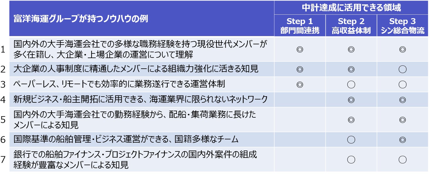 •富洋海運グループは外航海運やスタートアップ投資等の組織としてのノウハウを持つに限らず、中計内に置かれたマイルストンを一つ一つ達成していくにあたり、お力添えできるメンバーを抱えております。