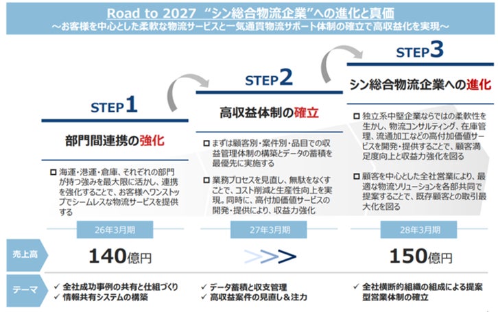 •中計では2028年3月期には売上高150億円並びに高収益化(営業利益率4.5%)の実現と高い目標を掲げております。市場が縮小する国内(内航)事業のみならず、富洋海運グループとの協業により、戦略次第で高い成長性が見込まれる外航海運事業を同時並行で強化することで、中計の数値の達成確度が高まると考えます。