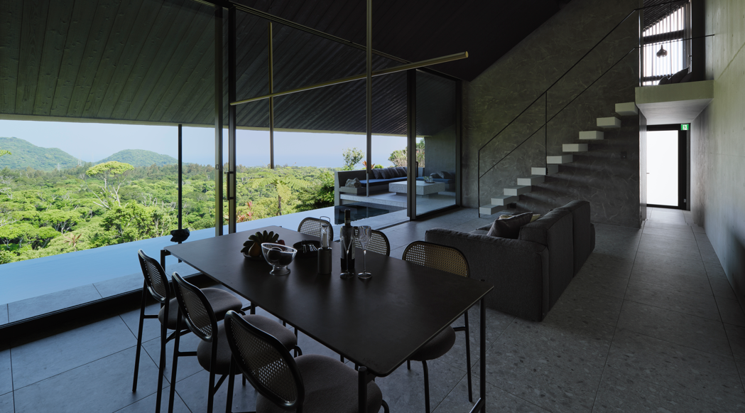 大きな窓いっぱいに広がるやんばるの森は、朝・昼・夕方でその表情を変え、ただ眺めているだけで心がほどけていくような静けさがあります。