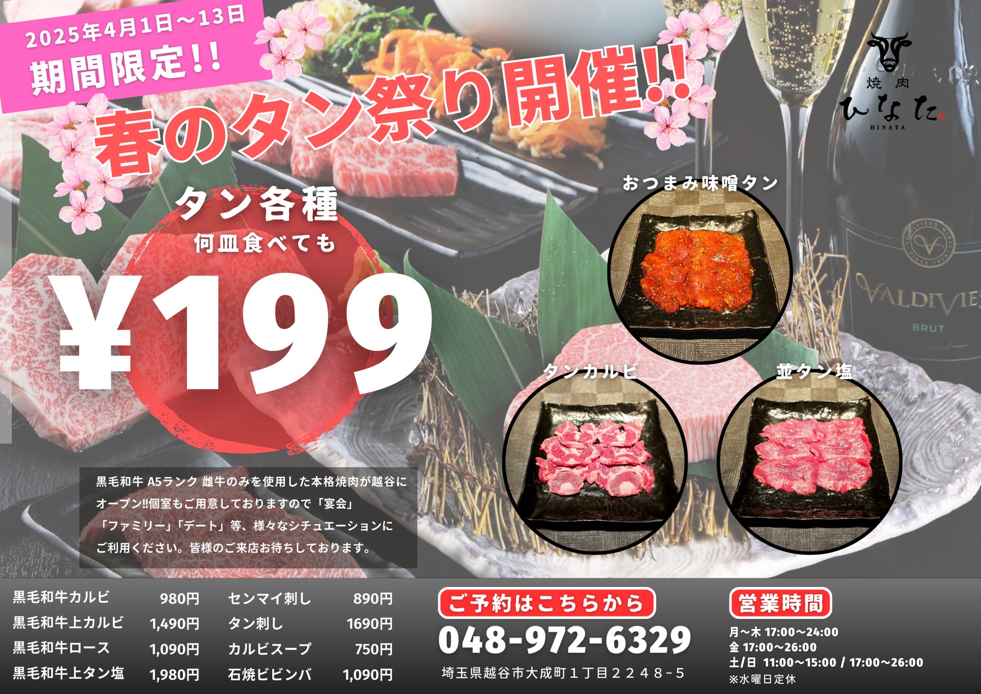 焼肉ひなた 越谷【春のタン祭り】開催!! 人気のタンメニュー各種¥199 2025年4月1日〜13日