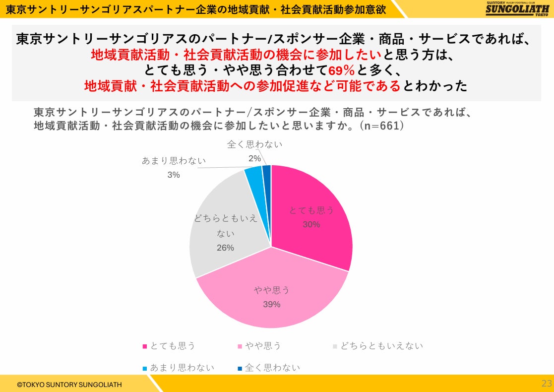 東京サントリーサンゴリアスファンにとって、東京サントリーサンゴリアスパートナー企業の商品・サービスは「安心・信頼しやすく」「購入意欲向上」につながることが明らかとなり、企業は東京サントリーサンゴリアスとのパートナーシップにより、ファンに対して商品・サービスの安心・信頼感醸成や、購買促進をすることが可能になると考えられます。またパートナー企業の新商品やサービスに対する意見やアイデアを提供する機会や、地域貢献活動・社会貢献活動の機会に参加したいというファンも多く、今後、東京サントリーサンゴリアス・パートナー企業・ファンとのコラボレーションの可能性が示されました。