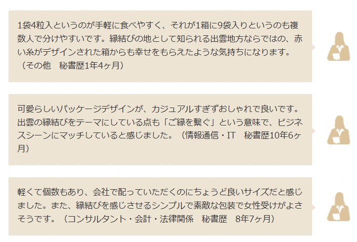 また、現役秘書が商品の品評を行い、企業へ評価結果をフィードバックするため、自分では気付きづらい、強みや弱みを知ることができ、商品のブラッシュアップやブランディングに役立てていただけます。サイト掲載による認知拡大だけではなく、マーケティングデータをお渡しすることで、商品そのものの価値を向上させるお手伝いが出来ればと思います。