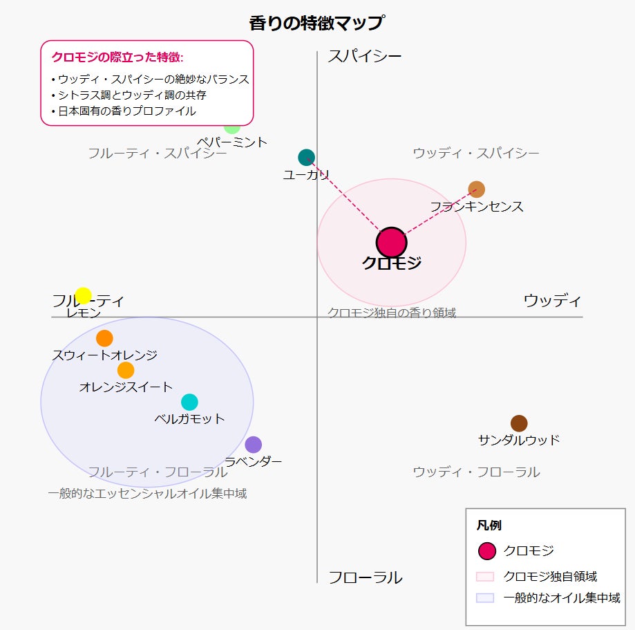香りのポジショニングマップで見ると、クロモジは他のエッセンシャルオイルとは全く異なる位置にあります。フランキンセンスに近い高級感を持ちながら、日本固有の複雑で深みのある香りを持っていると考えられます。