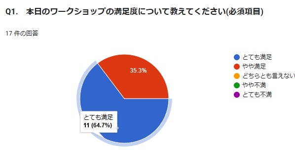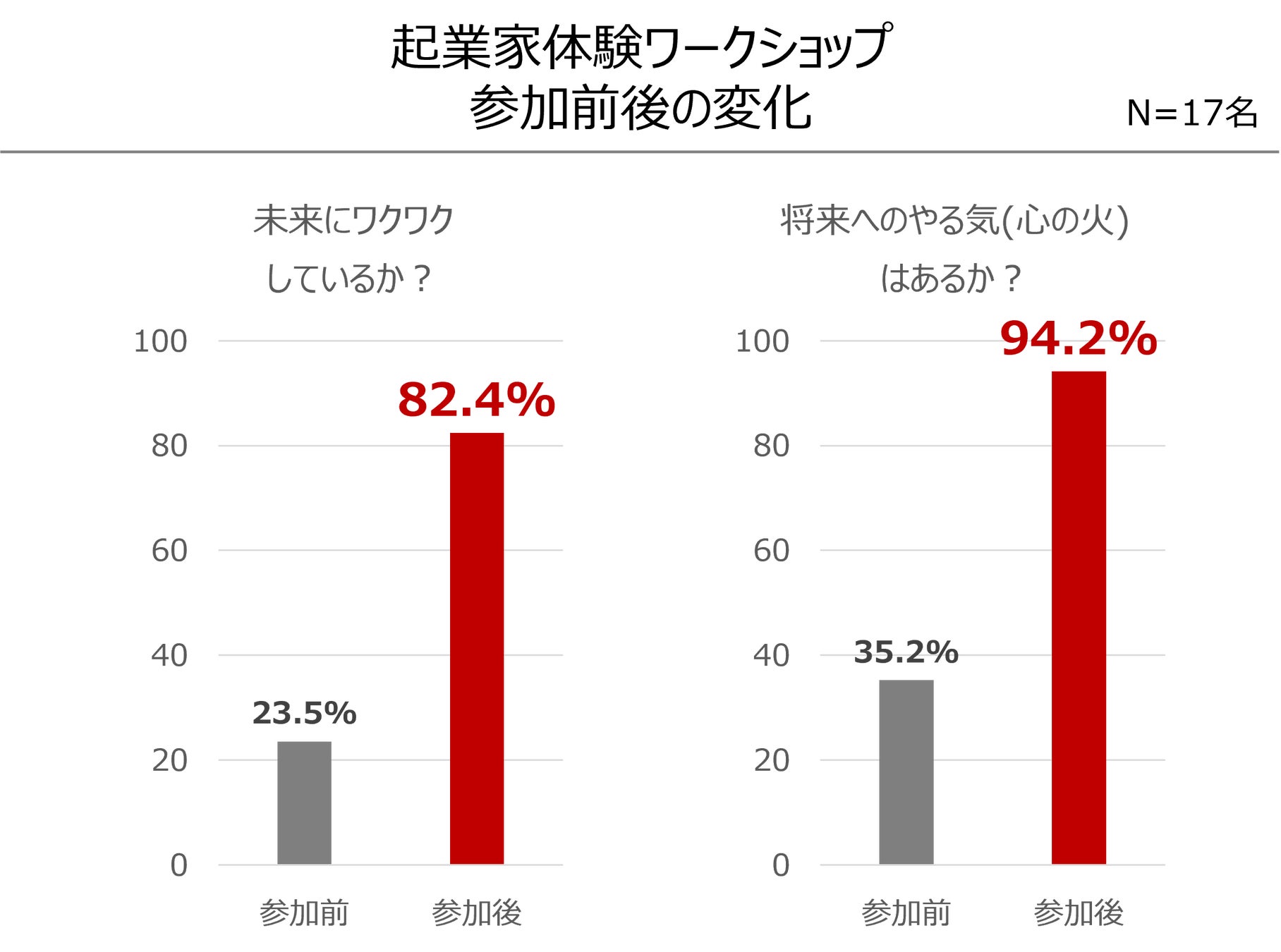 3月のワークショップに参加した生徒のアンケート結果からは、満足度が100%(とても満足:64.7%、満足:35.3%の合計)を達成したほか、「未来へのワクワク感」が23.5%から82.4%へ、「将来へのやる気」が35.2%から94.2%へと大幅に向上したことが示されています。