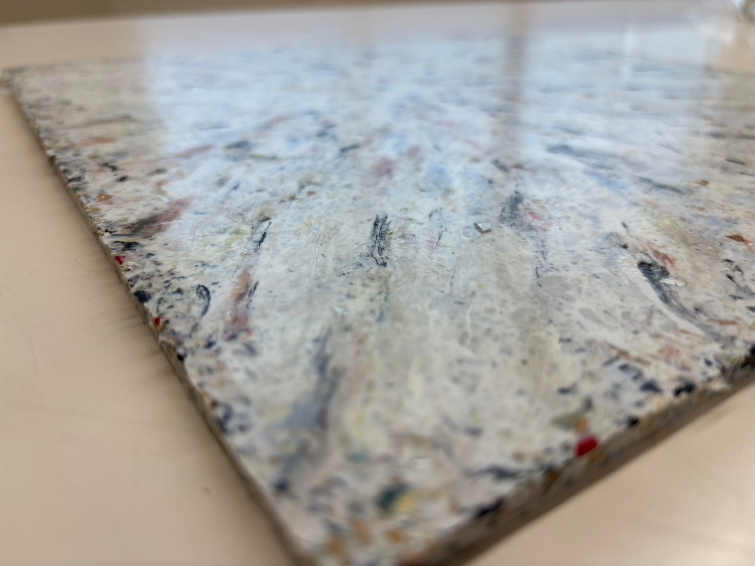 これはただの板ではありません。そこには、お菓子の袋、家庭のごみ、海岸に打ち上げられた漂着プラなど、「もう使えない」とされた素材が命を吹き返した姿があります。