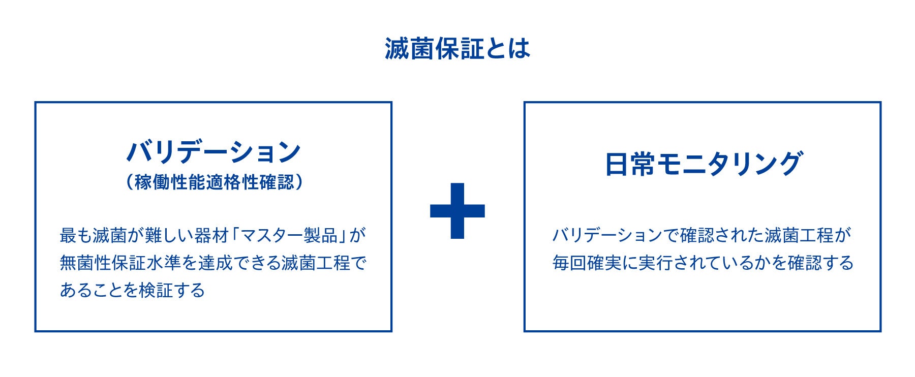滅菌保証は、2つのプロセスで構成されます。1つは、「バリデーション」(稼働性能適格性確認)と呼ばれる、無菌性を確認する試験です。バリデーションは、その施設が滅菌する器材の中でもっとも滅菌が難しいもの(マスター製品)が、無菌性保証水準(SAL≦10⁻⁶)を達成できる工程であるかを検証します。2つめは、「日常モニタリング」です。日常モニタリングでは、バリデーションで確認された工程が、毎回の滅菌で正しく実施されているかを確認します。