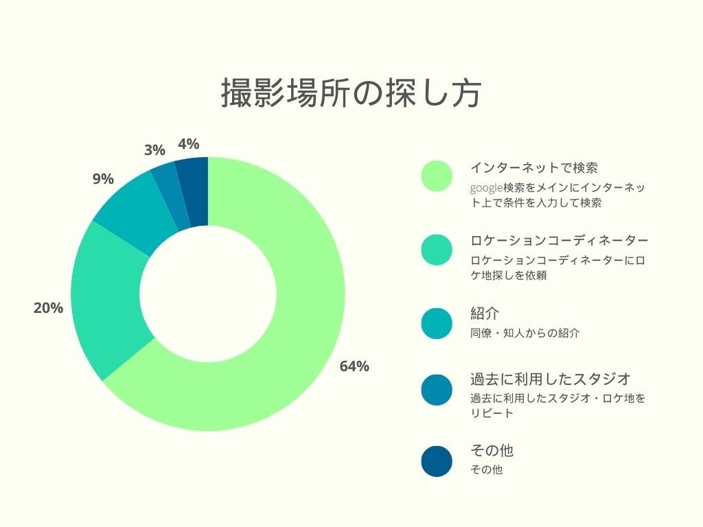過去、当社が映像制作会社に行ったアンケート結果によると、撮影場所の探し方として「インターネットで検索する」という回答が6割以上という結果となりました。