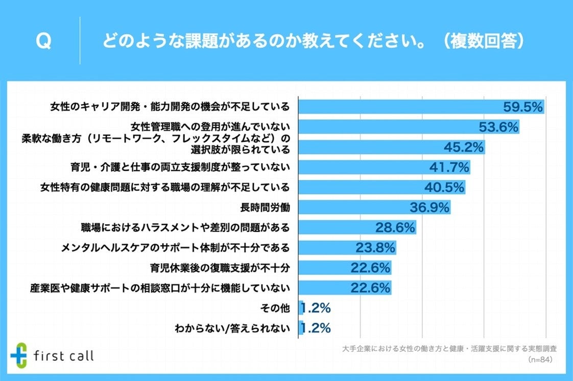 また、「非常に課題があると思う」「いくつか課題があると思う」と回答した方に、「どのような課題があるのか」を調査したところ、「女性のキャリア開発・能力開発の機会が不足している」が59.5%、「女性管理職への登用が進んでいない」が53.6%、「柔軟な働き方(リモートワーク、フレックスタイムなど)の選択肢が限られている」が45.2%となりました。